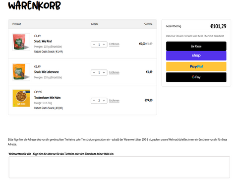 Sobald du dein Lieblingsvutter ausgewählt hast und der Warenwert mindestens 100 € beträgt, kannst du über das Textfeld unter deinem Warenkorb die Adresse für das Tierheim oder den Tierschutz deiner Wahl angeben. Bitte achte darauf, dass du die Adresse korrekt angibst, damit dein Paket auch genau dort ankommt, wo es gebraucht wird.